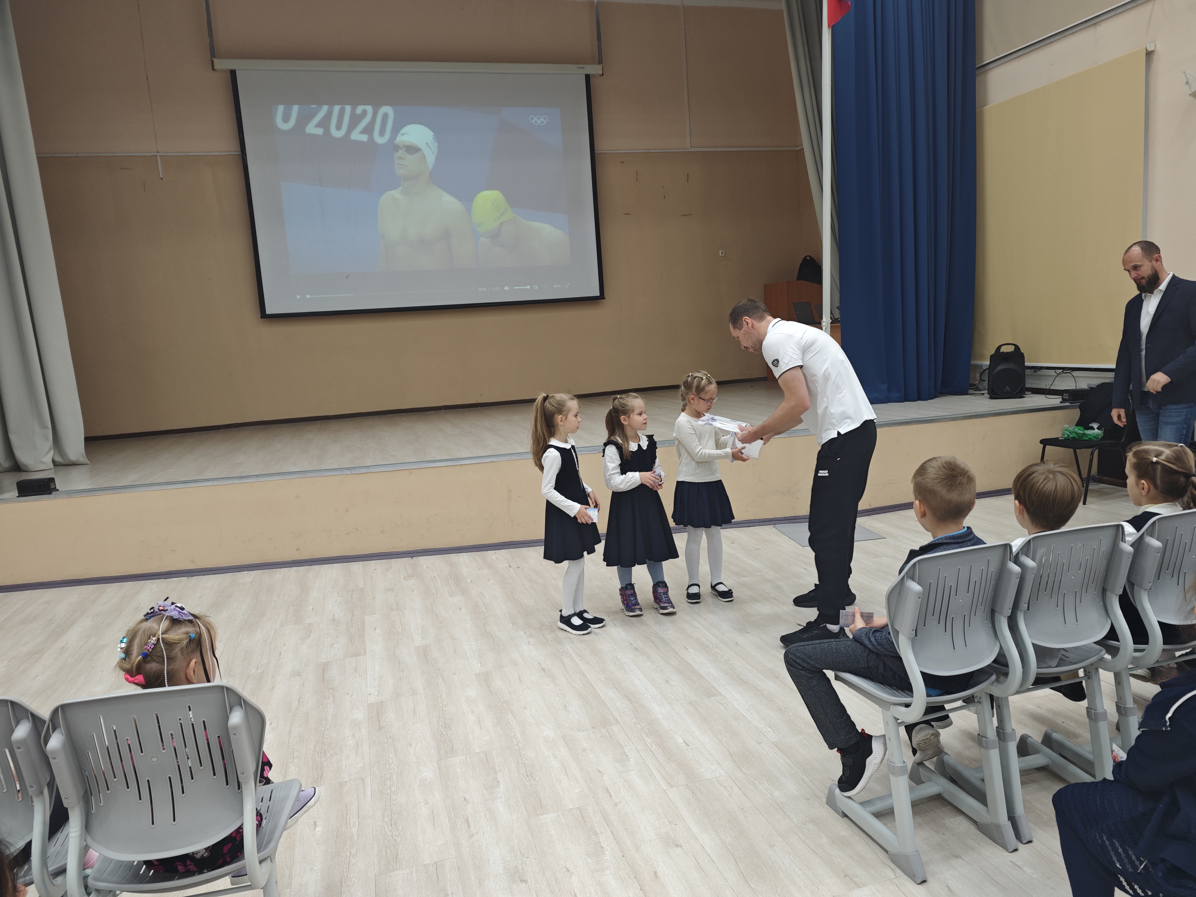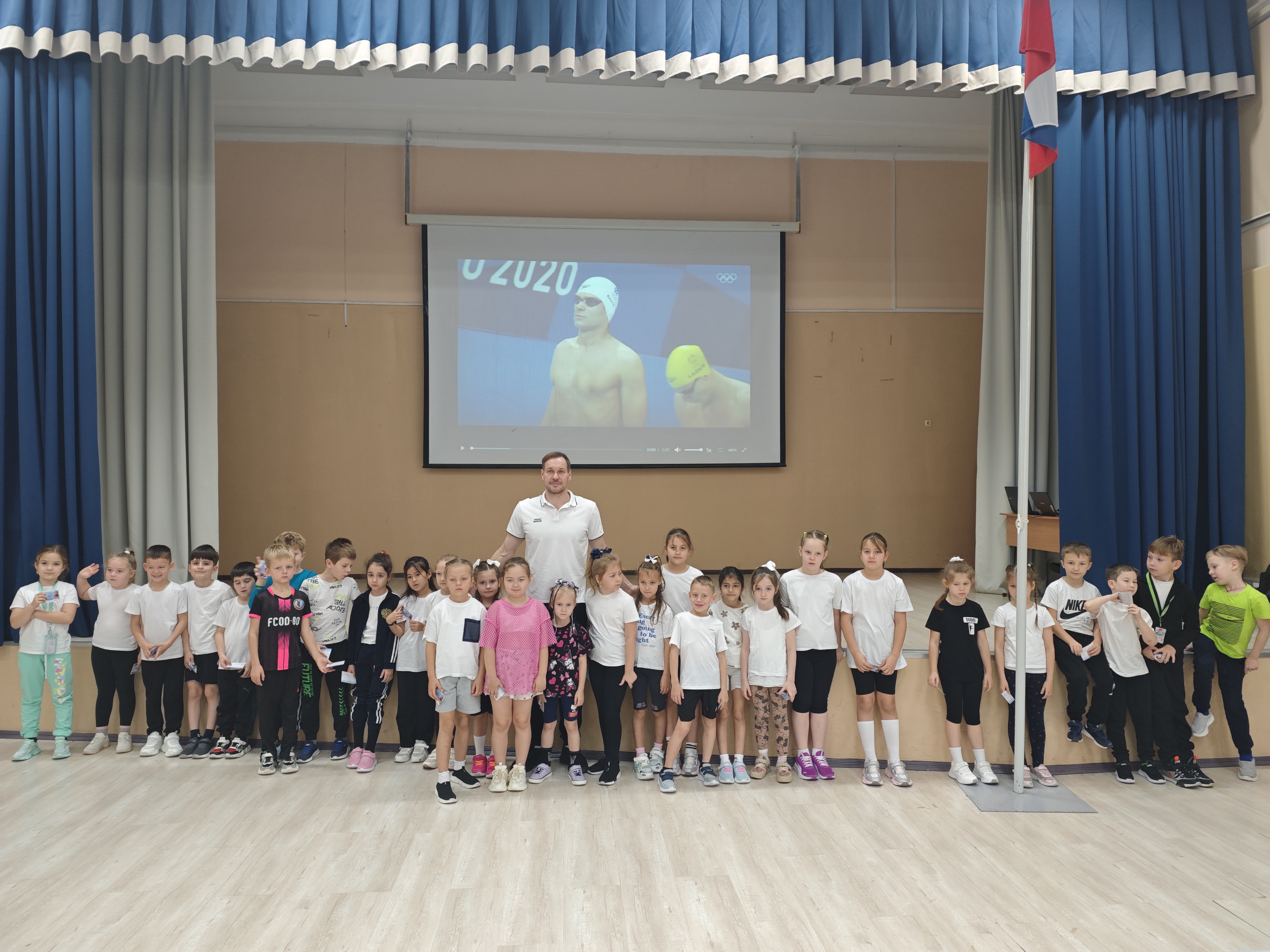 Урок чемпионов провели Шишин Андрей Геннадьевич — главный тренер сборной России и Шершуков Сергей Вячеславович — чемпион по плаванию.