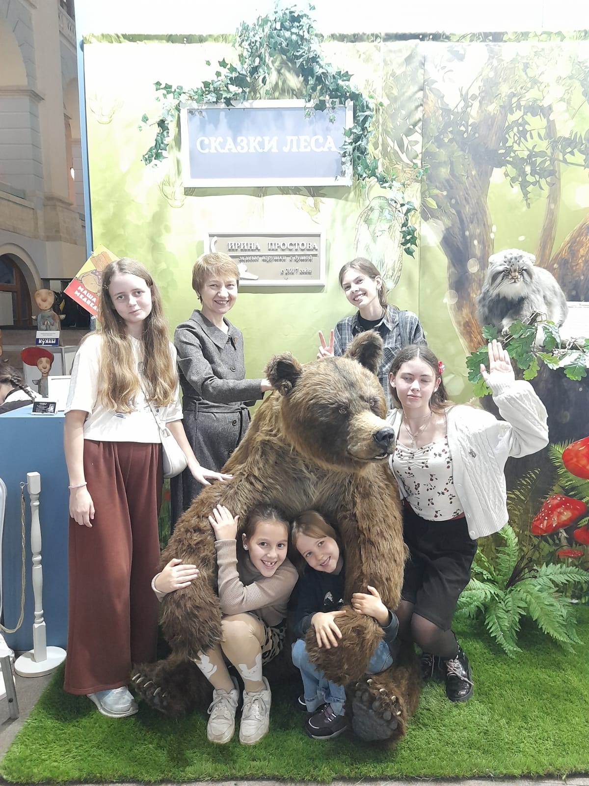 Мы много фотографировали, общались с художниками, покупали подарки близким. Прощаясь с выставкой, сфотографировались с медведем, выполненным в натуральную величину художницей Ириной Простовой.