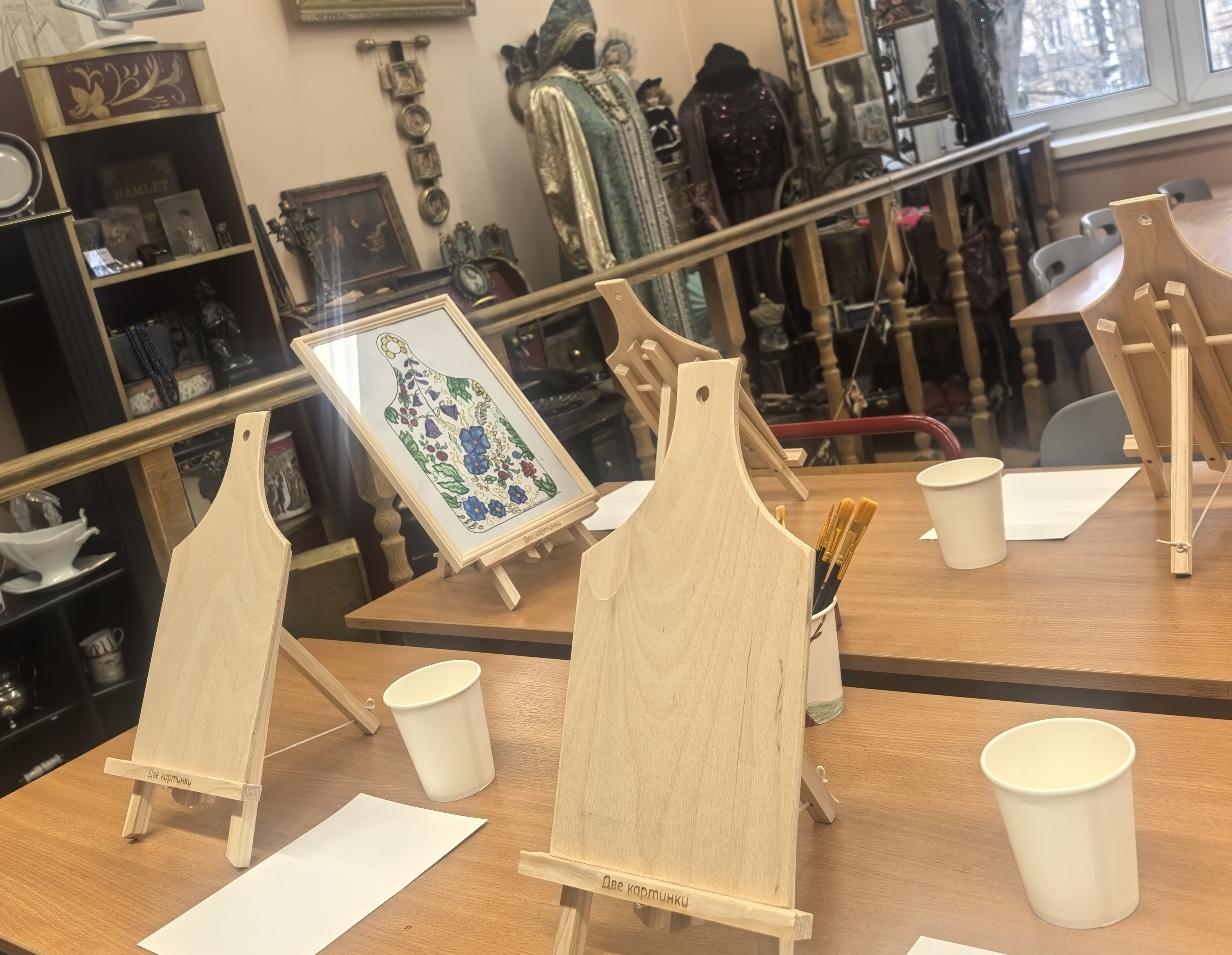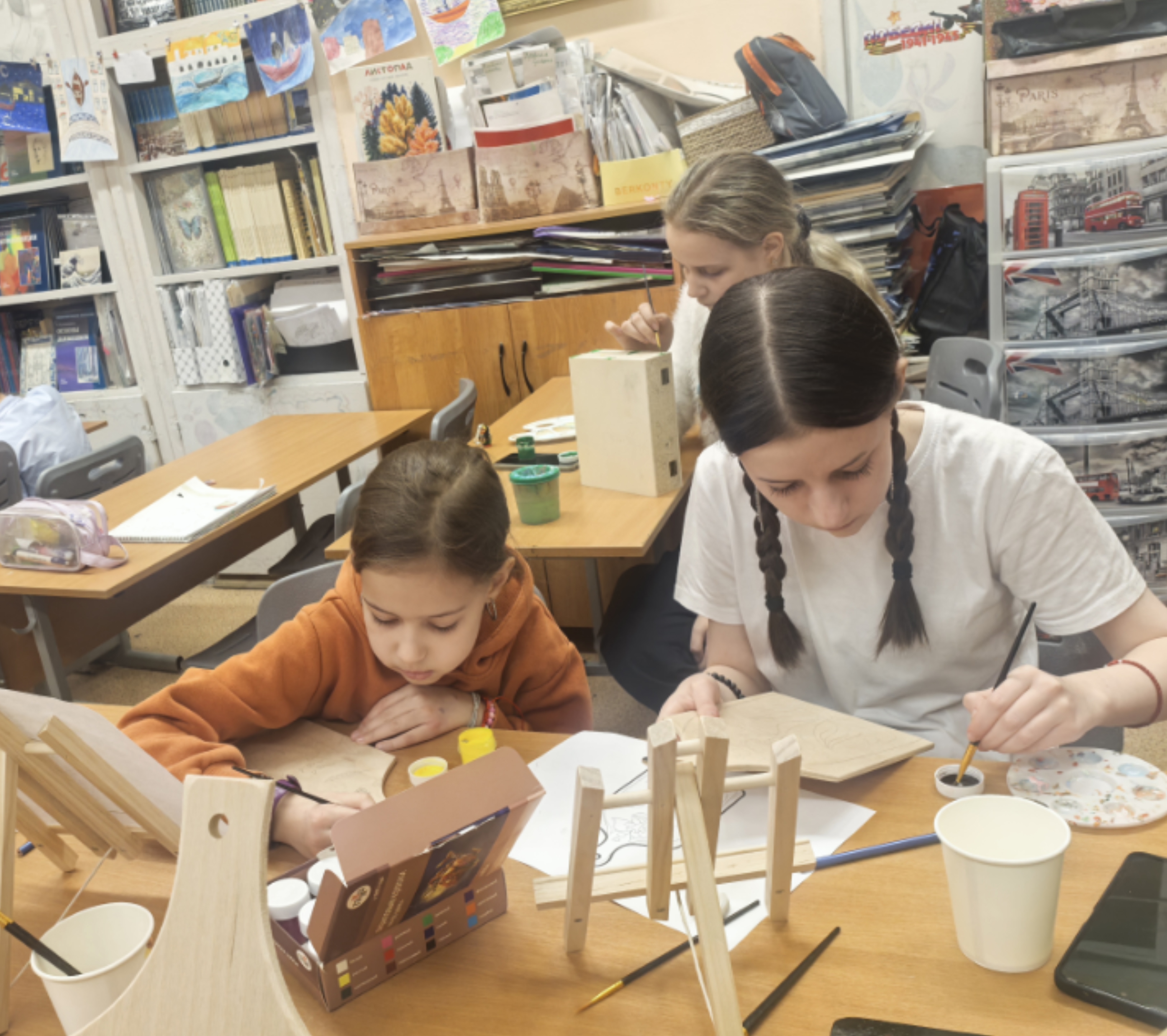 В рамках открытия выставки «Расписное чудо» Виктория провела мастер-класс по росписи разделочной доски для учащихся 2-8 классов. В начале мастер-класса Виктория познакомила участников с особенностями росписи по дереву, с ее историей, поделилась своими секретами работы над росписью, рассказала где черпает вдохновение и берет идеи для своих удивительных работ.